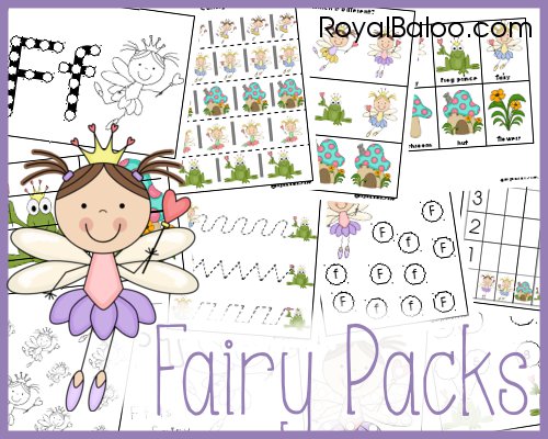 PreK: 3-part cards, patterning cards, what comes next?, 4 piece puzzles, which is different?, prewriting page, beginning sounds, what color is the fairy?, 1-10 puzzle, 11-20 puzzle, clip and count cards, dot the Ffs, shadow matching, roll and graph, roll and color, trace the fairy, color by size, ff is for fairy/frog, read and write the room, dot marker, color by letter.